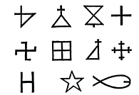 The last of these is the well-known vesica piscis, the symbol of Christ among the primitive Christians, and the last but one is the Pythagorean pentalpha. A writer in the London Times (August 13, 1835) is incorrect in stating that these marks are confined to Germany, and are to be found only since the twelfth or thirteenth centuries. More recent researches have shown that they existed in many other countries, especially in Scotland, and that they were practised by the builders of ancient times. Thus Ainsworth, in his Travels (ii., 167), tells us, in his description of the ruins of Al-Hadhv in Mesopotamia, that “every stone, not only in the chief building, but in the walls and bastions and other public monuments, when not defaced by time, is marked with a character which is for the most part either, a Chaldean letter or numeral.” M. Didron, who reported a series of observations on the subject of these Masons’ marks to the Comité Historique des Arts et Monumens of Paris, believes that he can discover in them references to distinct schools or Lodges of Masons. He divides them into two classes: those of the overseers, and those of the men who worked the stones. The marks of the first class consist of monogrammatic characters; those of the second, are of the nature of symbols, such as shoes, trowels, mallets, etc.